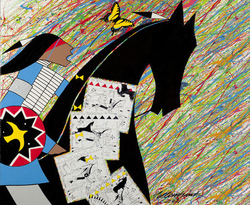 "I believe that we are born as stars and that we return to the stars. When we cross from North to South, we follow the Star Path — the Milky Way. The red hand represents myself, carrying a star within it. The dragonfly holds a special spiritual meaning for me; it is also a messenger to the stars. The sun symbolizes Life, for without it there would be no life. The four rawhide medicine wheels represent the four directions — West (Black), North (Red), East (Yellow), and South (White). These colors appear in the four triangles at the bottom, evoking He Sapa, the Black Hills, where I live. I also rubbed earth from Senegal into the background to anchor the work in this moment of my life. It is a gesture that expresses both presence and gratitude."